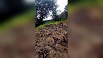 Caçamba se solta de caminhão, cai na pista e quase atinge motociclista; câmera registra acidente