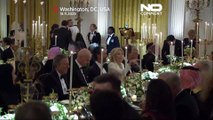 Prezydent USA Donald Trump i pierwsza dama Melania Trump witają króla Karola III i królową Kamilę z Wielkiej Brytanii przy południowym portyku Białego Domu w Waszyngtonie.