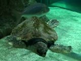 Une tortue de mer se déplace dans l'aquarium sous le regard d'une petite fille