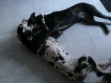un dogue ayant peur d'une feuille