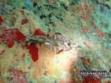 The favorite food of the Queen Triggerfish, also called the Old Wife in the West Indies, is the sea urchin. The triggerfish repeatedly squirts water through its pointed snout at a sea urchin until it becomes dislodged and tumbles over. Once the urchin is upside down, the Queen Triggerfish attacks the soft, unprotected underbelly and has a meal. As can be seen in this video, fish rarely have the opportunity to enjoy their dinner in piece. Everything in the ocean scavenges and is not beyond stealing scraps of meals from others.