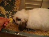 Caramel, mon lapin bélier nain me fasant des léchouilles sur la main.