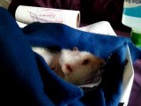 Sur cette vidéo, on peut voir Sae au début faisant la belle pour avoir à manger (et m'invitant à la suivre dans le salon, où elle sait qu'elle aura de la pâtée ^^). Mais voilà, arrivée dans le salon, on peut entendre une porte qui grince (il s'agissait de l'un de mes coloc' qui sortait de sa chambre), et là, elle change totalement d'attitude. Ayant vécu plus de la moitié de sa vie dans la rue, elle est encore très effrayée par les humains, et donc la seconde partie de la vidéo souligne le contraste entre la Sae qui commence à s'épanouir, mais en même temps l'enfant effrayé qui a besoin de se sentir en confiance...