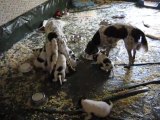 Portée d'Epagneuls Français à J36 : la mère et ses petits