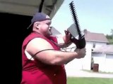 worlds strongest redneck cutting his hedge with his new invention chainsaw on a rope.