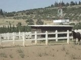 Séance de travail en filet américain et tapis (amortisseur pour plus de confort cheval et cavalière).