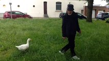 Mario et son oie se baladent en rue à La Louvière Bouvy