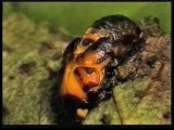 La sortie de la nymphe mobile du cocon a été ratée mais on peut voir la découpe extrêmement nette de la "porte" de sortie.