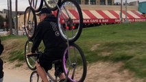 Rider shows off his bike with neon lights at Venice beach parade
