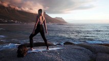 Woman Meditating - Yoga Warrior Pose - The Ocean, - Beach - Rock Mountains - Workout.